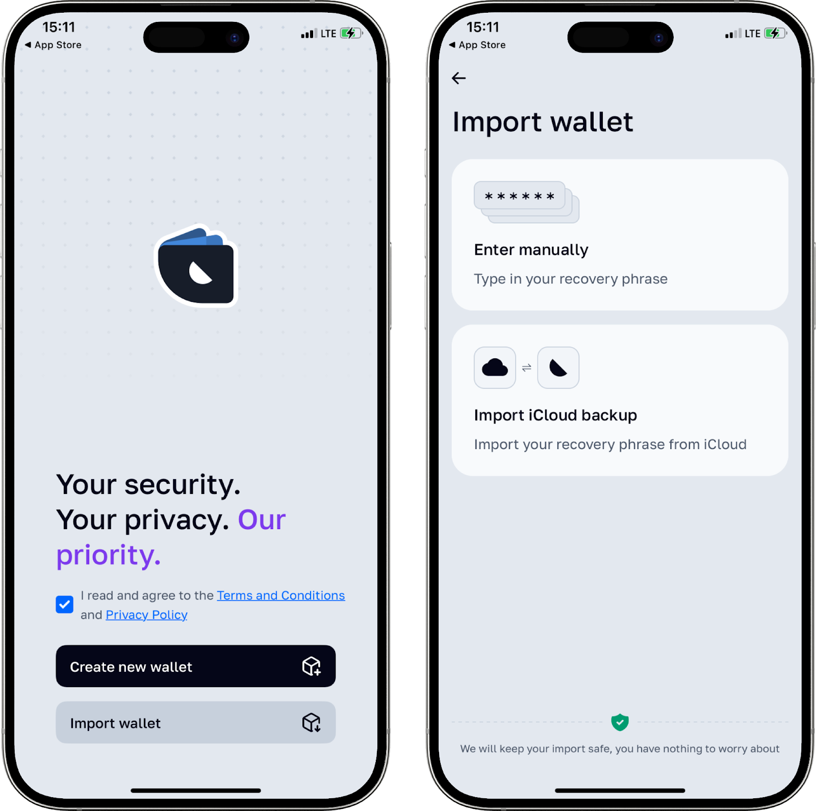 Önemli: Daha önce cüzdanın eski sürümünde (Whitewallet) hesap oluşturduysanız, “Import wallet” seçeneğine tıklayarak bilgilerinizi içe aktarabilirsiniz.