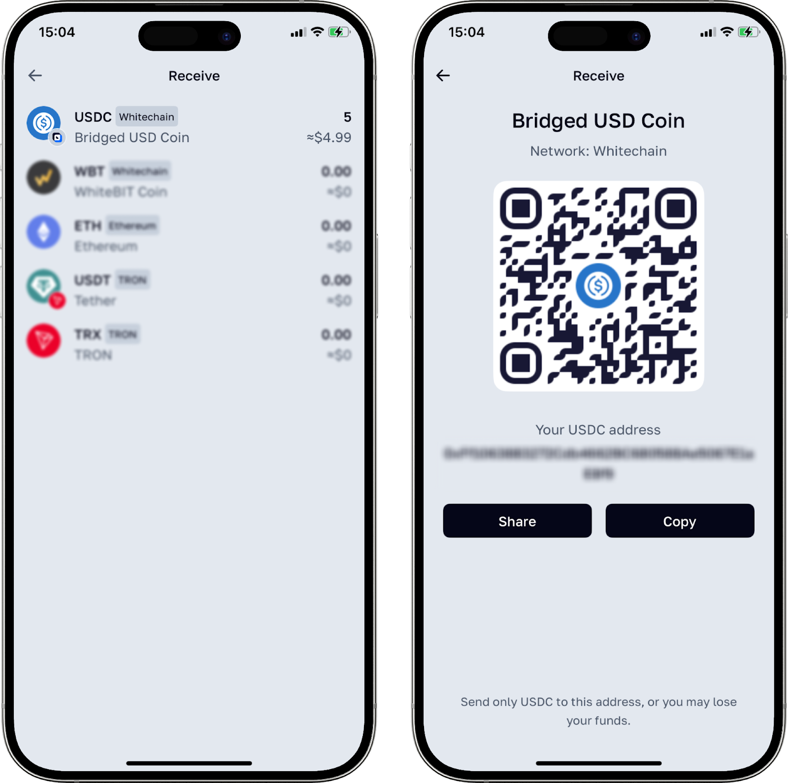 - Sonra cihazınızda para yatırma adresi ve QR kodu ile bir pencere açılacaktır. İlgili düğmeye tıklayarak adresi kopyalayabilirsiniz. Ayrıca, QR kodunu paylaşma veya gönderenin platformunda tarama fırsatı da vardır.