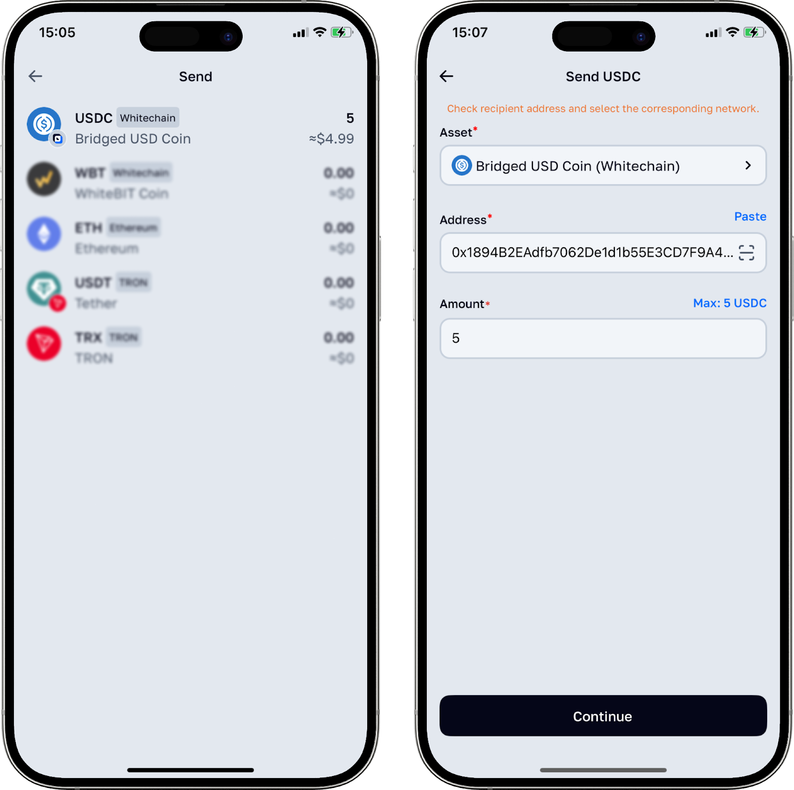 - Adresi ve çekilecek tutarı girin. Ardından, “Continue” düğmesine tıklayın.